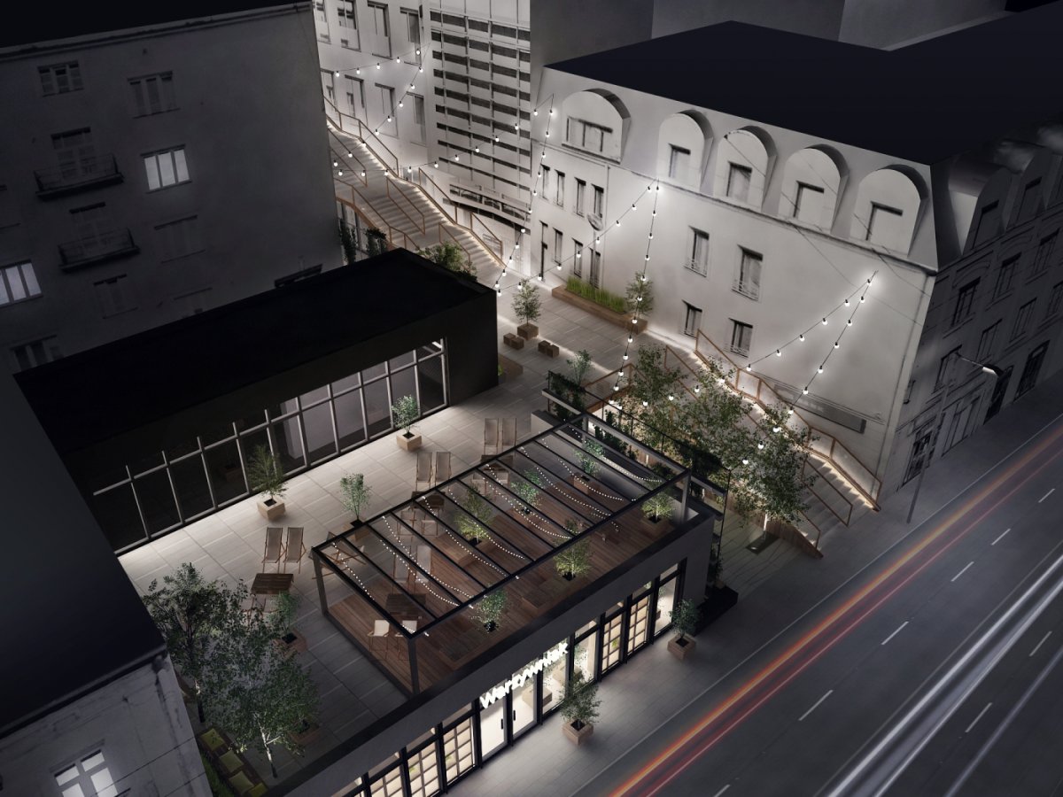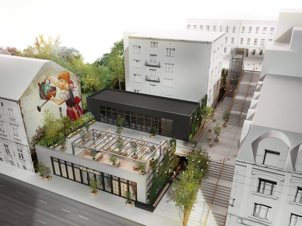 "Nagroda za udaną próbę kreacji atrakcyjnej, zatopionej w zieleni przestrzeni publicznej. Zachowując tradycyjne dwa ciągi schodów, zaprojektowano niewielki plac, skutecznie integrujący wejścia do sąsiednich budynków. Przestrzeń pod schodami, dostępna z poziomu ulicy Kalwaryjskiej przeznaczona jest dla usług. Dzięki temu dojście do windy może stać się pełnym uroku miejscem spotkań mieszkańców."